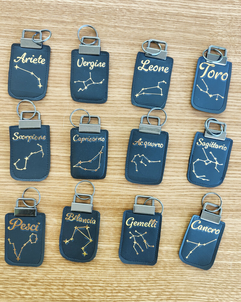 Portachiavi in similpelle nera. Nel davanti nome e costellazione del segno zodiacale. Nel dietro 3 parole caratteristiche di ogni segno.